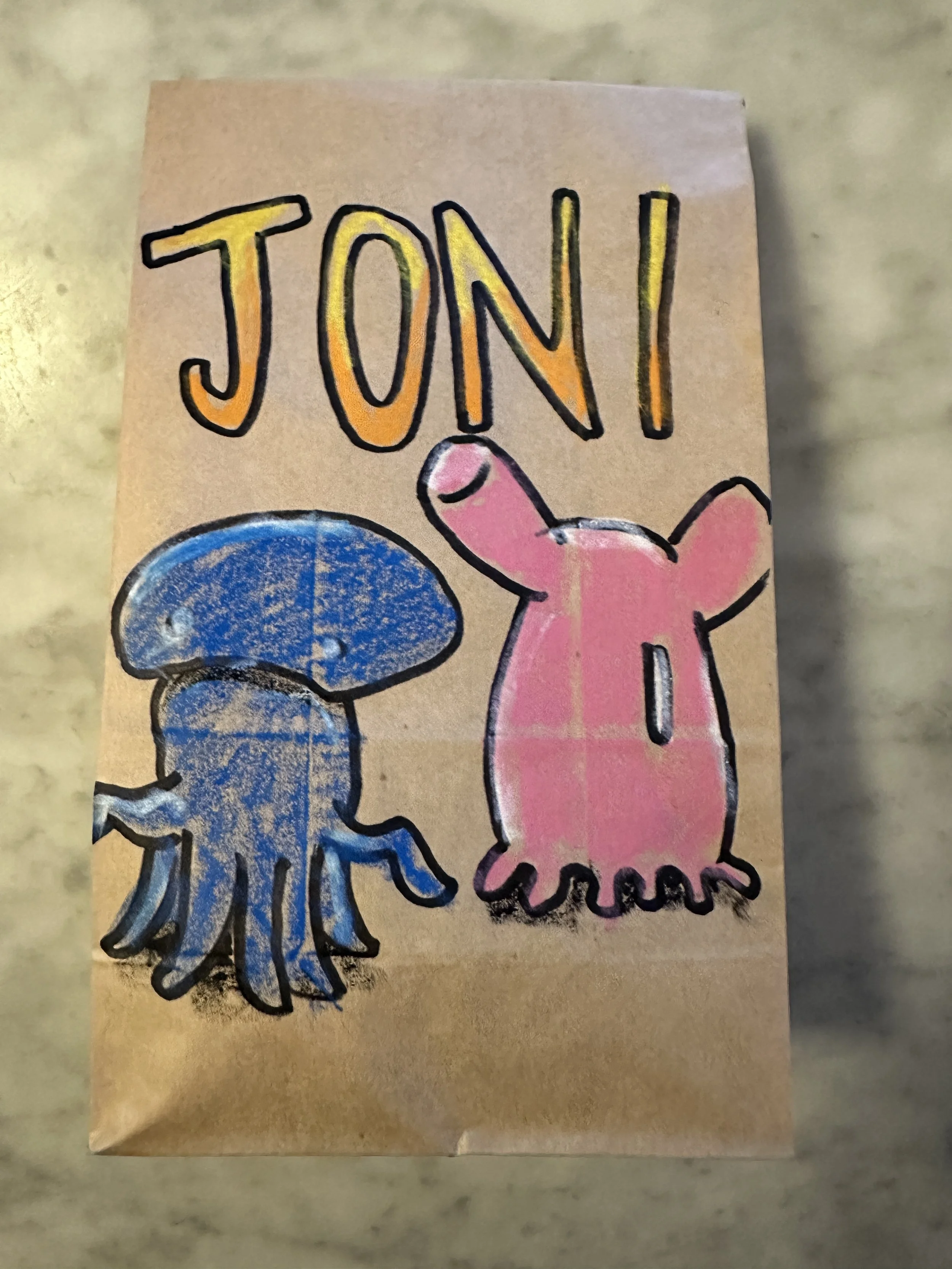 I make Joni’s lunch and snack bag every morning. I get to draw on the snack bag, and it’s a little like Morning Pages.